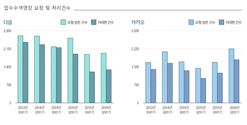 네이버와 포털 다음에 대한 압수수색 영장 집행은 여전히 많았으나 점차 줄어드는 추세다. 포털 다음이 수사기관의 요청에 응한 건수는 2014년 상반기 2262건에서 2014년 하반기 2136건, 2015년 상반기 1905건, 2015년 하반기 1207건, 2016년 상반기 1295건으로 나타났다. 포털 네이버 역시 2014년 상반기 4405건에서 2014년 하반기 3783건, 2015년 상반기 4345건, 2015년 하반기 3303건, 2016년 상반기 3387건으로 감소하는 추세를 보였다.