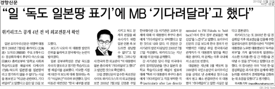 경향신문이 19일 입수한 폭로전문 사이트 위키리크스의 미국 외교전문을 보면, 강영훈 주일 한국대사관 1등서기관은 교과서 문제에 대해 이 대통령이 후쿠다 총리에게 “기다려달라”고 부탁했다고 말한 것으로 나와있다.