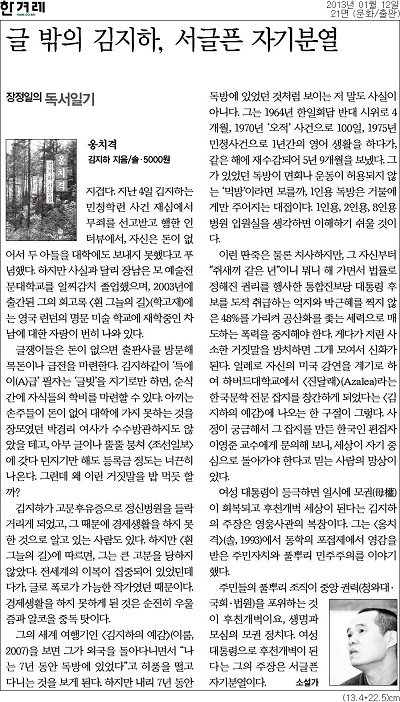 장정일 소설가는 12일자 한겨레에 기고한 "글 밖의 김지하, 서글픈 자기분열"이라는 글에서 김지하 시인의 회고록 <흰 그늘의 길>, 김지하 소설가의 세계 기행기인 <김지하의 예감>, <옹치격> 등을 인용해 최근 김지하 시인의 행보를 강도높게 비판했다.