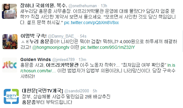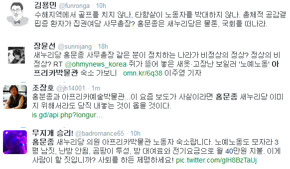장하나 민주당 의원은 트위터를 통해 “홍문종 사무총장, 아프리카 박물관 운영에 대해 몰랐다? 담당자 문책? 모르면서 사인한 것도 당신 책임”이라고 말했다. 노동법 위반으로 수사를 받아야 한다는 의견도 쏟아졌다. 한 누리꾼은 “이런 범법자가 입법부 의원이라니 나라 망신이다. 당장 구속 수사하라”라고 요구했다. 한 누리꾼은 정부가 상습적으로 임금체불을 일삼는 사업주에게 밀린 임금의 2배를 배상하도록 하는 방안을 추진하는 것을 두고 “홍문종부터 부탁드린다”고 말했다.
