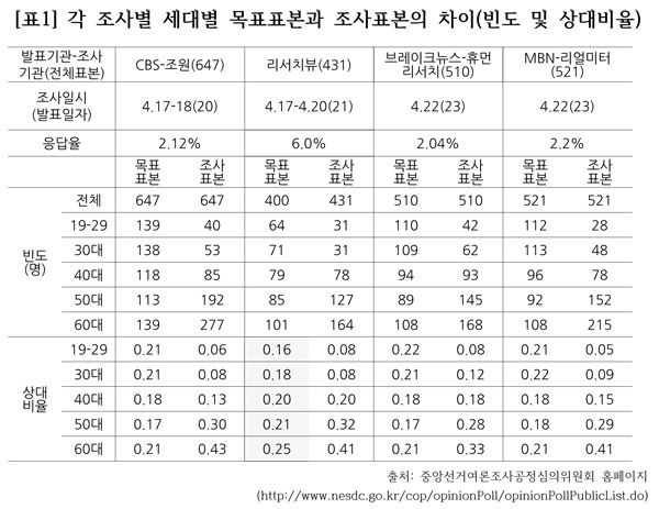 문제는 이런 세대별 표본 불균형 현상이 리서치뷰만의 문제는 아니었다는 점이다. 물론 심지어 리서치뷰 조사의 경우는 목표할당 자체도 다른 조사기관들과 큰 차이를 보여 여러 문제들이 복합적으로 나타났음을 알 수 있다. 그러나 [표1]에서 20대와 30대는 합해서 전체 표본의 42%의 비율(20대 21%, 30대 21%)을 채워야 하지만 브레이크뉴스-휴먼리서치 조사, CBS노컷뉴스-조원씨앤아이 조사, MBN-리얼미터 조사 공히 대부분 15~20% 수준에 그쳤다. 2030세대에서 2배 이상의 가중치를 주었음을 확인할 수 있다. 반대로 5060세대의 경우 전체응답자의 38%를 확보해야 하지만, 네 기관 모두 64~73%나 되어 고연령층이 과대 표집된 표본으로 조사했음을 알 수 있다. 충격적인 결과다. 낮은 응답율 문제 정도는 눈에 들어오지도 않는다.