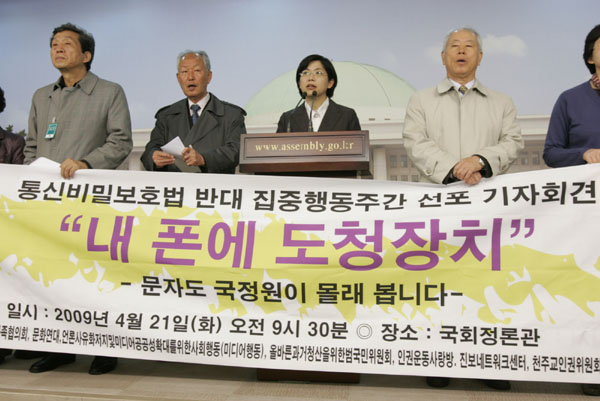 | ▲ 한나라당 이한성 의원이 발의한 통신비밀보호법 개정안과 관련해 미디어행동, 진보네트워크센터 등 10여 개 단체가 지난해 4월 서울 여의도 국회 정론관에서 반대 기자회견을 열고 있다. 휴대전화 감청을 허용하는 이 개정안이 통과되면 국민에 대한 전체주의적 감시통제가 심화될 것이라는 주장이다. 이치열 기자 truth710@ | ||