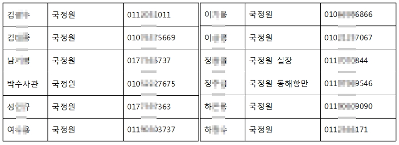 휴대폰 주소록에 있는 국정원 관계자 12명 가운데 정ㅇㅇ씨는 국정원 실장으로, 나머지 11명은 ‘국정원 동해항만’, 국정원 등으로 저장돼 있었다.
