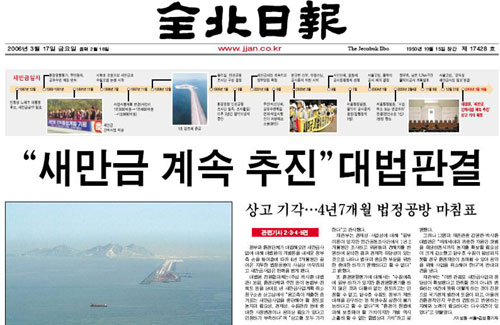 방폐장 유치 실패 이후 '이제는 새만금'이라며 반대여론을 홀대하던 전북지역 종합일간지들은 지난달 16일 새만금사업을 계속하라는 대법원 판결이 나자 새만금관련보도에 속도를 더하고 있다.