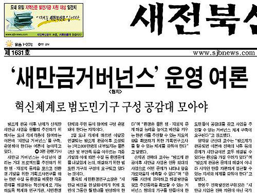 새전북신문이 다른 신문과 다른 점은 지난 3일자에서도 두드러졌다. 새전북신문은 이날 1면 머리기사 <‘새만금 거버넌스(협치)' 운영 여론>에서 "새만금 비전을 현실화시키기 위해 도민이 그동안 뭘했나를 반성해야 한다"(홍욱희 세민환경연구소장) "방조제가 완공되면 이른바 전북의 낙후 문제가 모두 해결될 수 있다는 우려를 가질 수 있다"(양재삼 군산대 교수) 등 전문가 의견을 전했다.