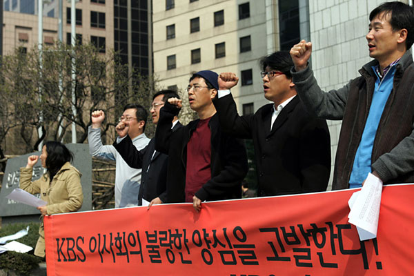 | ▲ 문화연대, 언론연대, 전국언론노조는 15일 서울 태평로 프레스센터 앞에서 KBS 이사회의 활동경비 인상을 규탄하는 기자회견을 열었다. ⓒ이창길 기자 photoeye@ | ||