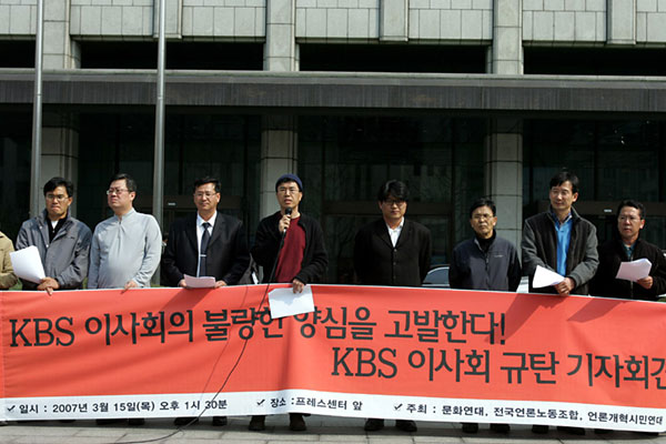 이날 기자회견에 참석한 문화연대 전규찬 미디어문화센터 소장은 "시민사회단체의 시청각미디어시장 개방과 한미 FTA 반대 목소리에는 침묵하면서 자신들의 수당이나 인상하는 엉터리 KBS 이사회를 끝까지 고발하고 반드시 책임을 묻겠다"고 밝혔다.