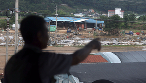 땀냄새가 스쳤다. 붉은 체크셔츠에 소금기가 서려있었다. 끊어진 길 끝에 선 중년의 사내. 무너져 내린 마을에서 시선을 거두지 못했기에, 주름진 얼굴은 내리쫴는 햇빛을 속절없이 맞았다. 그는 손가락으로 붕괴된 마을을 가리켰다. 땅이 계속 바깥으로 밀리고 있다고 말했다. 당장이라도 바스러질듯한 붉은 흙 위에 얹혀져 있는 각종 건물들, 마치 바닥에 난 거대한 구멍에 빨려들어갈 듯이 위태로워 보였다. 인기척이 사라진 터전에는 새소리만이 정적을 달랬다. 체크셔츠의 중년 사내는 폭우로 사라진 상능 마을의 이장이었다. 그는 오전에는 수해 복구