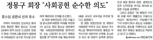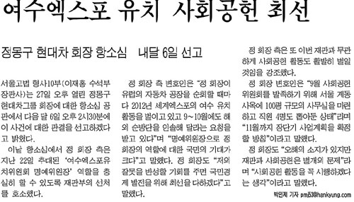 정 회장에게도 선처를 호소할 이유는 있었다. 2012여수엑스포유치위원회 명예위원장이자 1조원의 사회환원을 약속한 상태이기 때문이다. 28일자 일부 언론은 정 회장의 선처 호소를 기사 제목으로 뽑았다. 같은 날 지면에 여수엑스포 기사가 배치된 것은 어쩌면 당연한 일이었다.