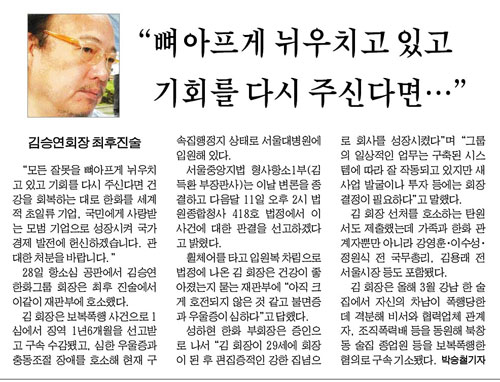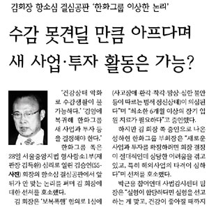 하지만 29일자 김승연 회장 관련보도도 28일자 정몽구 회장 보도와 다를 게 없었다. <수감 못 견딜 만큼 아프다며 새 사업·투자 활동은 가능?>(한겨레 10면)과 같은 상식적인 질문을 던지는 기사가 오히려 이상해 보일 지경이다.