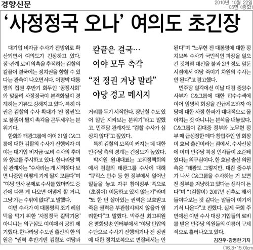 그런 점에서 대검 중수부의 이번 C&그룹 수사는 여러 가지 시사점을 준다. 특히 야권을 겨냥한 사정의 칼날을 노골화하고 있다는 점에 주목할 필요가 있다. 경향신문은 22일자 5면 <'사정정국 오나' 여의도 초긴장>이라는 기사에서 “야권은 검찰의 수사 확대가 '전 정권'으로 불똥이 튈지 촉각을 곤두세우는 분위기”라고 보도했다.