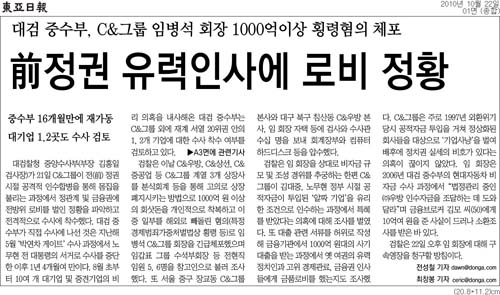 한국일보는 3면 기사에서 “C&그룹 수사와 관련해 현역 야당의원 P씨, L씨, 또 다른 P씨 등 서너 명과 경제관료 출신으로 관계와 재계에 영향력이 큰 L씨 등의 이름이 오르내리고 있다”고 보도했다.