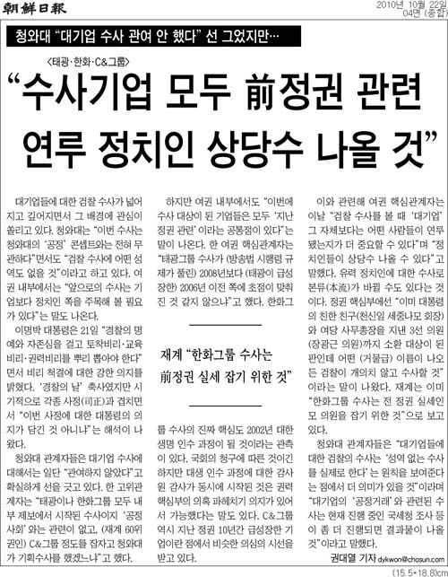 조선일보는 4면 <"수사기업 모두 전 정권 관련 연루 정치인 상당수 나올 것">이라는 기사에서 “여권 내부에서도 '이번에 수사 대상이 된 기업들은 모두 '지난 정권 관련'이라는 공통점이 있다'는 말도 나온다”면서 “재계는 이미 '한화그룹 수사는 전 정권 실세인 모 의원을 잡기 위한 것'으로 보고 있다”고 보도했다.