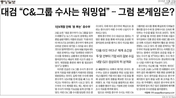 중앙일보는 3면 <대검 "C&그룹 수사는 워밍업"…그럼 본게임은?>이라는 기사에서 “중수부의 수사 체제를 봐도 제2, 제3의 대기업 수사가 이어질 가능성을 쉽게 감지할 수 있다”면서 “수사 착수 시기는 주요 20개국(G20) 정상회의(11월11~12일) 이후가 될 가능성이 크다”고 분석했다.