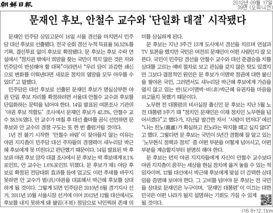 제1야당에서 대통령 후보가 선출되자 17일 조간은 관련 소식을 주요하게 다뤘다. 내용은 대동소이하다. 문재인 후보의 강점과 장점, 민주통합당 경선 결산, 안철수 원장과의 관계 등이 각 매체에서 지면을 통해 나갔다. 다만 언론사 입장을 드러내는 사설에서 보수 진영 언론과 진보 진영 언론의 온도차는 있다.