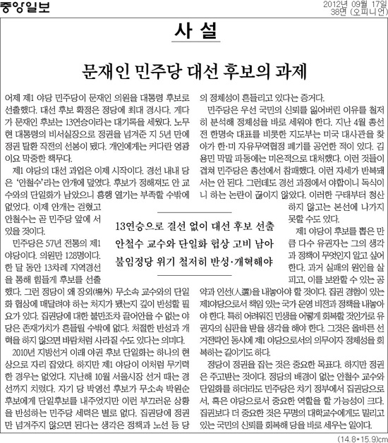 중앙일보는 이어 “2010년 지방선거 이래 야권 후보 단일화는 하나의 현상으로 자리 잡았다”며 “하지만 제1야당이 이처럼 무기력한 경우는 없었다”고 말했다. 또한 “집권당에 정권만 넘겨주지 않으면 된다는 생각은 정책과 노선 등 당의 정체성이 흔들리고 있다는 증거”라고 주장했다.