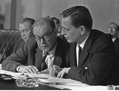 타게 에를란데르와 올로프 팔메(오른쪽)가 함께 자료를 살펴보는 모습. 1969년 팔메는 에를란데르의 뒤를 이어 스웨덴 총리이자 사민당 대표가 되었다. 팔메는 에를란데르의 보좌관이 되면서 정치에 입문했고, 그 시기에 사회민주주의자로서 가치관을 정립했다.