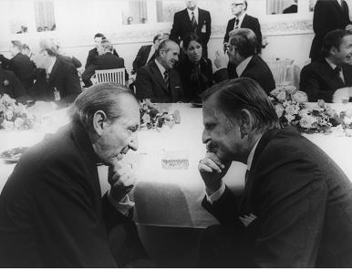 유엔 사무총장인 쿠르트 발트하임과 팔메(오른쪽)가 이야기를 나누는 모습. 1976년 선거에서 패한 후 총리직에서 물러난 팔메는 이란과 이라크 간 분쟁을 중재해 보라는 발트하임의 제안에 따라 국제 문제에 적극 관여했다. 이 같은 활동은 1982년 다시 총리가 된 후에도 계속되었다.