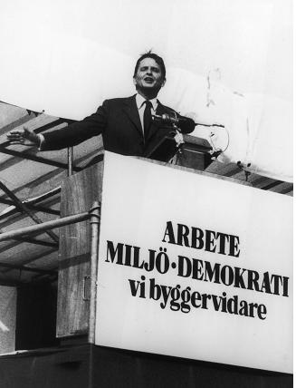 1985년 가을 총선 때 연설하고 있는 팔메의 모습. 이는 이듬해 암살당한 팔메가 치른 마지막 선거이기도 했다.