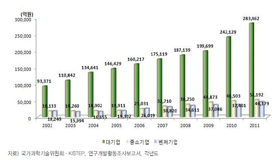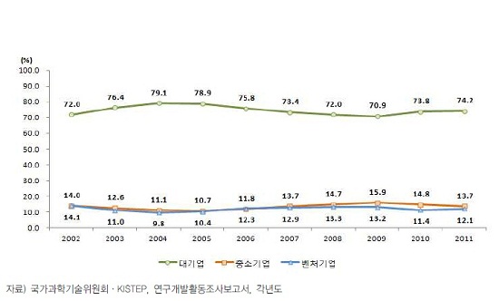 지난해 12월 한국과학기술기획평가원 안병민 부연구위원, 한국산업기술진흥협회 송현주 연구원이 작성한 <우리나라의 민간기업 연구개발활동 현황>을 보면, 2011년 기준 매출액 상위 5대 기업의 연구개발비는 전체 30.8% 수준이다. 상위 20대 기업으로 확대하면 43.3%다.