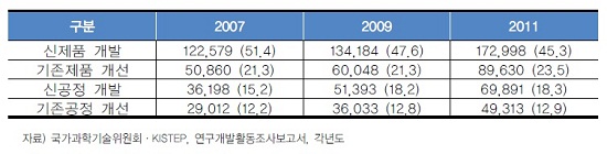 2012년 10월 기준 국내기업의 부설연구소는 2만 5427곳이고 이중 중소기업 연구소는 2만 3840곳으로 전체 93.8% 수준이다. 그러나 중소기업의 기업 당 연구개발비는 하향 추세다. 2007년 6.3억 원에서 2009년 5.9억 원, 2011년 5.2억 원이다. 기업 전체로 볼 때 중소기업의 연구개발비는 25.8%에 불과하다. 제품 혁신에 대한 투자는 줄고 기존제품 개선에 대한 투자가 오히려 늘고 있다. 이 같은 현황을 고려할 때 한국의 R&D 투자는 ‘속 빈 강정’이라고 평가할 수 있다.