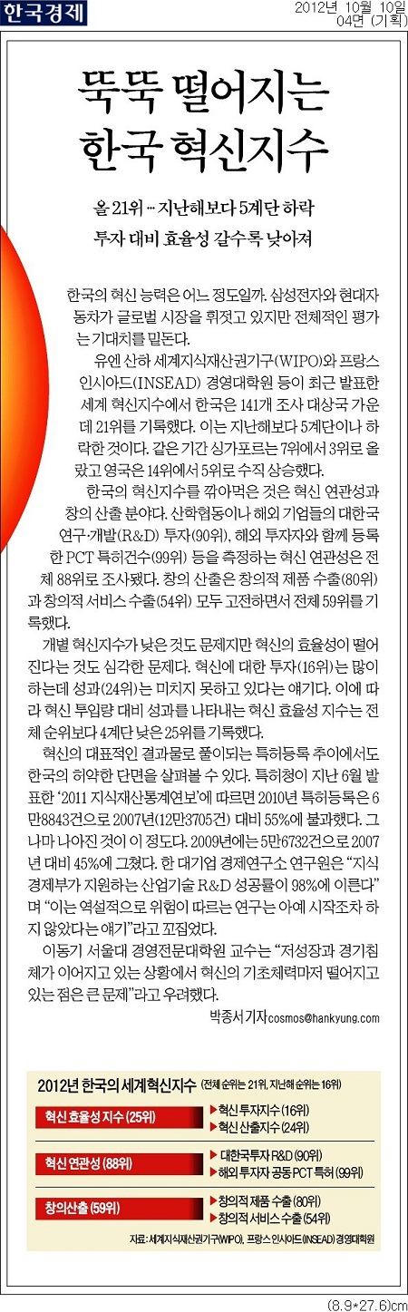 한국경제 2012년 10월 10일자 4면 기획기사 <뚝뚝 떨어지는 한국 혁신지수>에서 “한국의 혁신지수를 깎아먹은 것은 혁신 연관성과 창의 산출 분야”라면서 “개별 혁신지수가 낮은 것도 문제지만 혁신의 효율성이 떨어진다는 것도 심각한 문제”라고 지적했다. 이를 두고 한국경제는 “혁신에 대한 투자(16위)는 많이 하는데 성과(24위)는 미치지 못하고 있다”고 풀이했다. 한국의 혁신 효율성 지수는 25위였다.