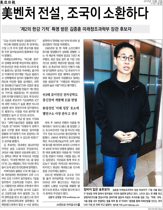 동아일보는 1면에서 미래창조과학부에 대해 “과학 및 정보통신기술(ICT)과 산업의 통섭을 통해 창조경제를 만들어 ‘제2 한강의 기적’을 만들겠다는 박 당선인의 강한 의지를 반영하고 있다”고 전한 뒤, “박 당선인은 김종훈 후보자가 기초과학과 ICT에 대한 이해도가 높을 뿐만 아니라 성공한 벤처 창업자이며 알카텔루슨트 벨연구소 사장을 지낸 풍부한 현장경험도 높이 산 것으로 보인다”고 ‘해석’했다.