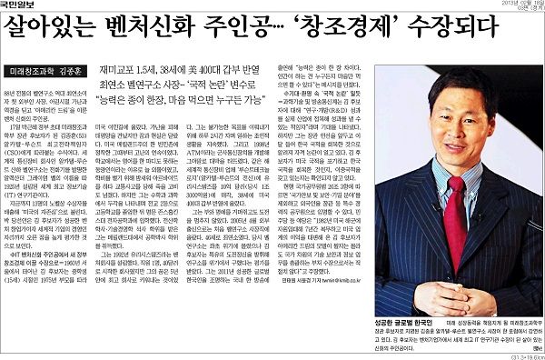 “‘아메리칸 드림’의 아이콘인 그가 이번에는 박근혜 정부의 아이콘이라 할 수 있는 미래창조과학부를 맡게 된 것” (조선일보 2월18일자 1면)