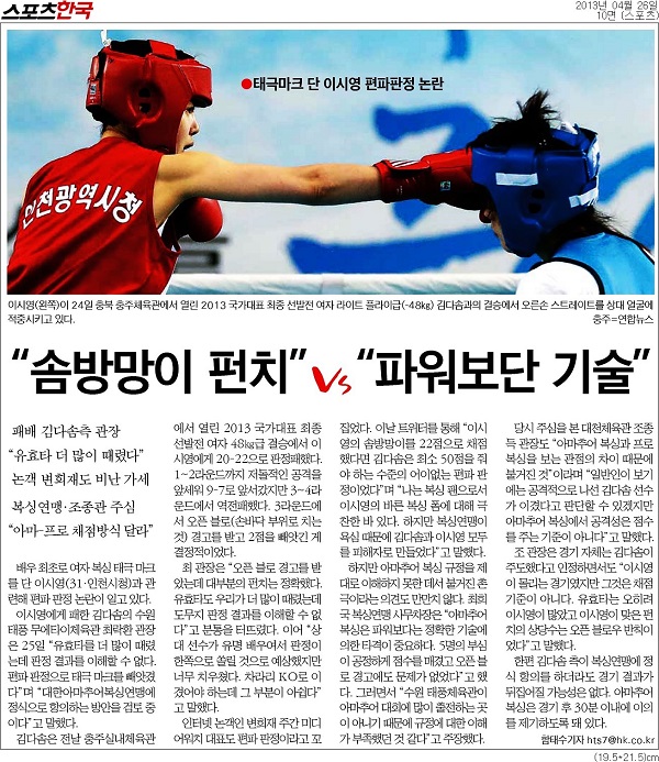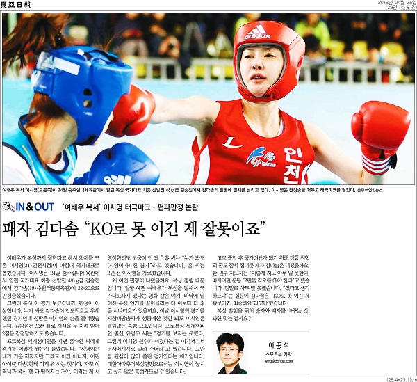 그런데 같은 날, 동아일보는 <패자 김다솜 “KO로 못 이긴 제 잘못이죠”>라는 제목의 칼럼을 29면에 내보냈다. 이종석 기자는 “누가 봐도 김다솜이 압도적으로 우세했던 경기인데 심판은 이시영의 손을 들어줬습니다”라고 문제를 제기했다.