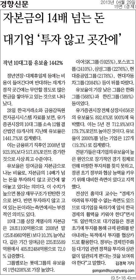 유보율 1442%는 자본금의 14배 이상의 돈을 내부 곳간에 쌓아뒀다는 뜻이다. 2008년 대비 10대 그룹 상장계열사의 자본금은 25조4960억 원에서 28조1100억 원으로 10.3% 늘었다. 같은 기간 잉여금은 235조5589억 원에서 405조 2484억원으로 72.0%나 급증했다. 롯데그룹의 유보율이 1만 4208%로 가장 높았다. SK그룹은 5925%이고, 포스코그룹은 2410%이다. 삼성그룹(2276%), 현대중공업그룹(2178%), 현대자동차그룹(2084%)이 뒤를 이었다.