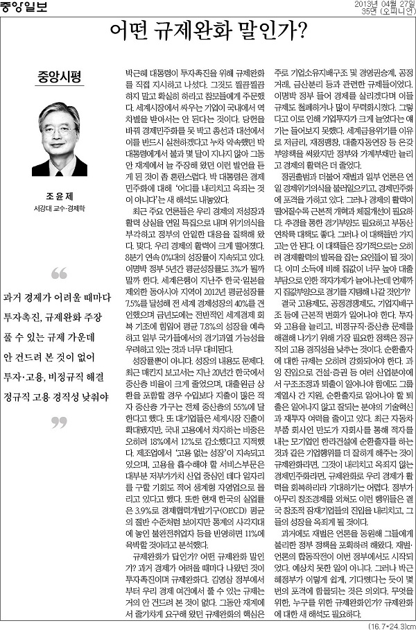 서강대학교 조윤제 교수(경제학과)는 지난 27일자 중앙일보 <중앙시평: 어떤 규제완화 말인가?> 제하 제목 칼럼에서 “과거 경제가 어려울 때마다 나왔던 것이 투자촉진이며 규제완화”라면서 “그렇다고 이로 인해 기업투자 크게 늘었다는 얘기는 들어보지 못했다”고 지적했다.