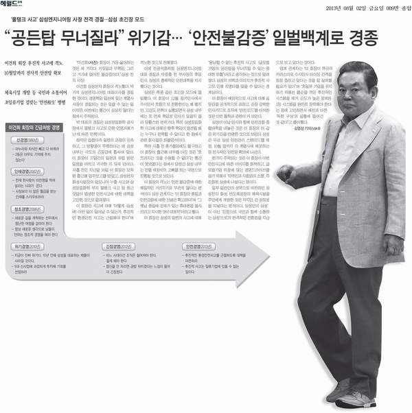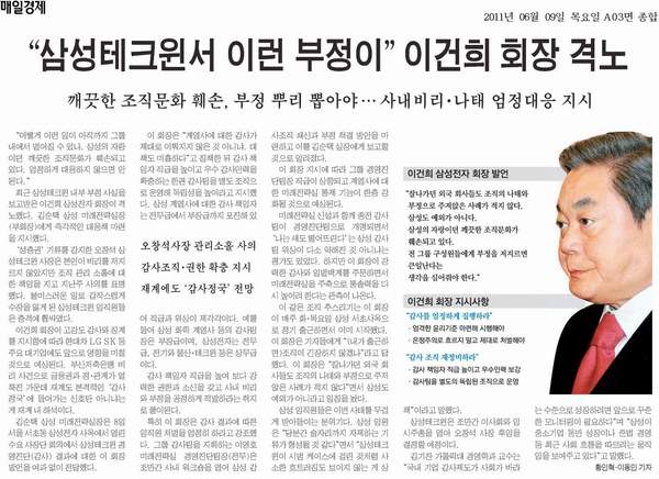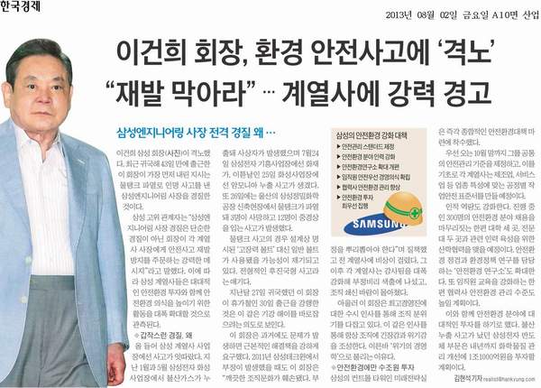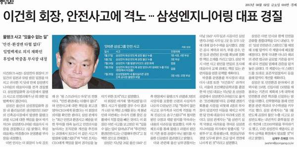 연합뉴스를 비롯해 주요 언론은 2일 “이 회장이 ‘있을 수 없는 일이 일어났다, 후진적인 환경안전 사고는 근절해야 한다’고 말했다”고 삼성 관계자의 말을 인용해 보도했다. 남의 회사 말하듯 하는 이 회장의 격노는 이명박 전 대통령의 유체이탈 화법을 연상시킨다. 이 회장은 말 한 마디로 사장의 목을 칠 수 있는 최고 의사결정권자지만 정작 자신은 아무런 책임도 느끼지 않는 것처럼 말한다. 그래서 격노의 대상은 자신이 아니라 월급쟁이 사장이다.