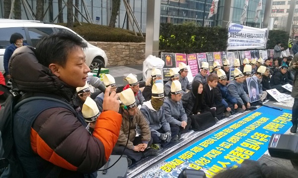 | ▲ 삼성전자서비스 최종범 열사 대책위원회가 12월 2일 서울 서초구 삼성전자 서초사옥 앞에서 기자회견을 열고 삼성 사과를 요구하는 노숙 농성을 시작한다고 알리고 있다.