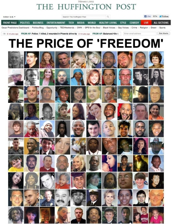 | ▲ 미국 허핑턴포스트는 2013년 2월 총기사건 희생자 100명의 사진을 첫 화면 머리기사로 내보냈다. | ||