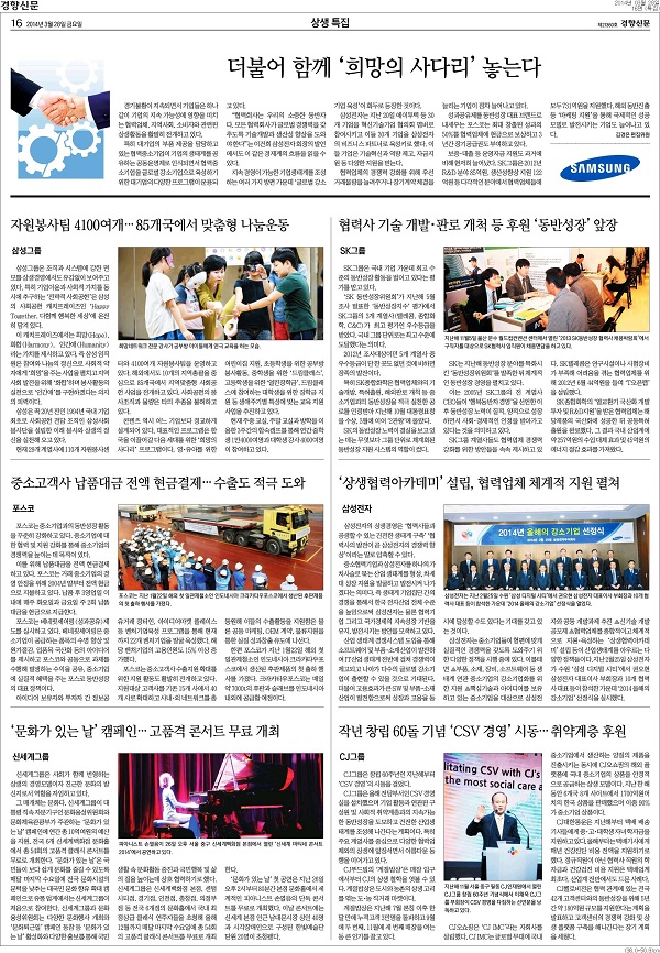 28일 전국단위 아침종합신문을 발행하는 언론사 세 곳에서 기업 특집을 내보냈다. 경향신문은 16~18면에 총 22개 대기업의 ‘상생’ 활동을 소개했다. 제목은 “더불어 함께 ‘희망의 사다리’를 놓는다”. 국민일보 18~20면에는 “기업 특성 살린 ‘창조적 나눔’으로 함께 멀리 간다”라는 제목으로 총 13개 대기업의 사회공헌 활동이 실렸다. 서울신문은 2개면(16~17면)에 14개 기업의 신사업, 신제품을 소개했다.