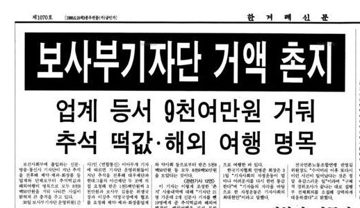 그는 1991년 11월 1일자 한겨레 사회면 머리기사 <보사부 기자단 거액 촌지> 사회면 톱기사를 보고 “망치로 머리를 맞은 것처럼 충격을 받았다”고 말했다. ‘업계에 요청 8850만원, 추석 떡값·해외여행 명목’이라는 부제까지 읽고는 “패닉상태가 됐다”고 정 위원은 썼다. 당시 기사내용은 ‘기자단이 추석을 전후해 대우재단과 아산재단 두 곳에 직접 요청해 받은 1500만 원씩 3000만 원과 보사부 위생국장과 약정국장에게 협조를 요청해 제약 제과 화장품업계와 약사회 등으로 받은 5850만 원 등 모두 8850만 원을 모았다’는 것이다. 물가인상 등을 감안하면 지금 따져봐도 엄청난 거액이다. 이 사건으로 당시 2명의 기자가 파면(해임)됐으며, 언론사마다 사과와 반성의 사고(社告)를 1면에 실었다.