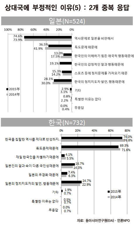 이번 조사에서 서로에 대해 좋지 않은 인상을 가지고 있다는 응답자들에게 부정적인 이유를 두 가지씩 꼽으라 한 조사 결과를 보면, 일견 양국 상호인식의 비관적 전망을 뒷받침하는 듯하다. 한국인은 일본이 한국을 침탈한 역사를 제대로 반성하고 있지 않다는 점(74.0%)과 독도문제(69.3%)를 압도적으로 꼽았다. 반대로 일본인은 한국이 역사문제로 일본을 계속 비판하기 때문이라는 응답이 74.6%, 독도문제 때문이라는 응답이 36.5%, 한국의 정치지도자의 발언과 행동을 탓한 응답이 28.1%로 뒤를 이었다(아래 그림 참조).