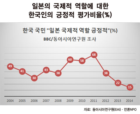 우선, 일본인들이 우려하고, 우리 국민들조차 많은 사람들이 오해하는 것이 한국인은 어떤 상황에서도 변하지 않는 뿌리깊은 반일의 DNA를 갖고 있다는 인식이다. 그러나 한국인의 반일정서는 상수가 아닌 양국 정부와 시민사회의 노력에 따라 가변적인 변수이다. BBC방송과 동아시아연구원이 2004년부터 매년 조사해온 국제조사 결과를 보자. 신사참배, 수정 교과서의 문부성 검정 통과 문제 등 고이즈미-아베총리가 집권한 2006년까지 시기에는 일본의 국제적 역할에 대한 한국인의 긍정적인 평가가 지속적으로 하락했다. 반면, 한일간 신시대선언에 합의한 2007년 야스오 총리 시기, 2009년 무라야먀 담화를 계승할 의지를 밝힌 유키오, 나오토 민주당 총리 시기를 거친 후 2011년 조사에서는 한국 국민들의 68%가 일본의 국제적 역할에 긍정적이라고 답할 정도로 우호적인 태도가 급증하였다. 그러나 아베총리의 재집권 이후 역사수정주의노선 및 일본의 군사적 역할 확대 움직임이 가시화되면서 급격하게 부정적 평가가 강화되고 있다. 한국 국민들의 일본에 대한 태도는 정부간 상호 노력에 따라 얼마든지 변동 가능한 변수임을 뚜렷하게 보여준다(아래 그림 참조).