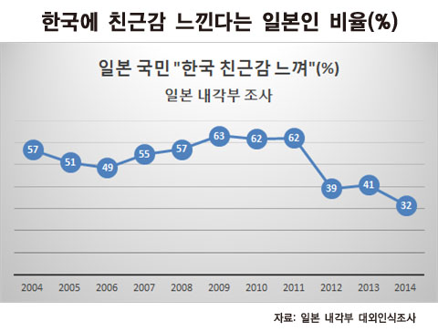 반대로 일본 국민들은 아베정부의 역사수정주의 및 우경화에 대한 자성의 목소리는 잊은 채 “사과 피로감”을 토로하며 한국 국민의 반일정서만 탓하고 있는가? 일본내각부가 매년 발표하는 대외인식조사에서 한국에 대해 친근감을 느낀다는 일본 국민의 응답비율을 보면, 2004년부터 2011년까지 과반 이상이 한국에 대해 친근감을 표시할 정도로 한국에 우호적이었다. 그러나 2012년 초 이명박 대통령의 독도방문을 계기로 일본에서 대한국 이미지가 급격히 악화되기 시작했다(아래 그림 참조).