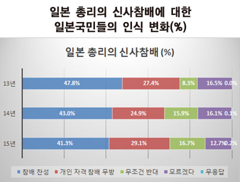 또한 한국에 대한 부정적인 인식이 강화되고 있음에도 불구하고 일본 국민들 사이에서 자성의 목소리가 점차 커지고 있는 점에도 주목할 필요가 있다. 아베총리의 야스쿠니 신사참배에 대해 2013년 조사만 하더라도 “참배해도 문제될 것이 없다”는 주장이 47.8%였지만, 올해 조사에서는 41.3%로 줄었고, “어떤 경우든 참배해서는 안된다”는 주장은 8.3%에서 16.7%로 두 배 이상 늘어났다. “개인자격으로 참배하는 것은 무방하다”는 제한적인 의견이 29.1% 수준이다. 아베총리의 참배정치에 대한 반대 또한 유보적인 태도가 늘어나고 있는 것이다(아래 그림 참조). 특히 2014년 일본 지식인 조사에서는 “어떤 경우든 참배해서는 안된다”는 의견이 52.6%로 신사참배에 대한 부정적인 목소리가 높았다는 점도 주목할 만하다.