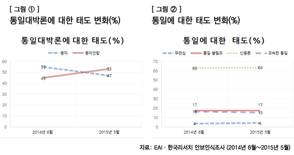 “통일대박론”으로 상징되는 박근혜 정부의 통일정책에 대한 국민들의 기대가 1년 사이에 식고 있음을 알 수 있다(그림 ①). 동아시아연구원(EAI)이 한국리서치에 의뢰에 2015년 5월과 2014년 6월에 실시한 여론조사 결과를 보자. 2014년 1월의 통일대박론, 3월의 드레스덴 선언 이후 실시한 6월 조사만 하더라도 박근혜 정부의 “통일대박론”에 대한 지지가 55%로 과반을 넘었다. 2014년 1월 박근혜 대통령이 내세운 “통일대박론”이라는 파격적인 메시지에 국민들은 긍정적으로 반응했다.