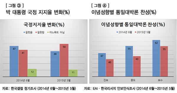 첫째, 무엇보다 대통령 국정지지기반이 약화되었다. 한국갤럽이 매월 발표하는 월별 국정지지율 조사결과를 보면 동아시아연구원 조사와 동일한 시기 동안 국정 지지율은 크게 하락했다. 박근혜 대통령에 대한 긍정평가 비율은 2014년 6월 47%로 과반에 가까웠지만, 2015년 6월 긍정평가 비율은 39%에 그쳤다(그림 ③). 이념적 보수층, 새누리당 지지층 등 박근혜 대통령의 핵심 지지층일수록 통일대박론에 대한 지지가 높다는 것은 주지의 사실이다. 이념성향별 통일대박론 찬성비율을 보면 2014년, 2015년 양 조사 공히 진보층에서는 통일대박론에 대한 찬성이 낮고, 보수층에서 찬성비율이 높다(그림 ④). 대통령 지지층의 감소는 통일대박론의 지지 감소로 이어진 것으로 볼 수 있다.