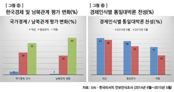 셋째, 현재 통일대박론에 대한 국민들의 지지가 냉각되고 있는 요인 중에서 간과되어서는 안될 것이 바로 체감경제가 나빠지고 있다는 점이다(그림 ⑤). 2015년 조사에서 55%가 작년에 비해 한국경제가 나빠졌다고 평가하고 있다. 체감경제가 개선될수록 대통령을 지지한다는 경제투표의 논리는 재론할 여지가 없다. 뿐 만 아니라 국가경제 상태에 대해 긍정적이고 자신감을 가진 사람에 비해 국가경제 상태에 비관적인 사람은 경제적 부담이 커질 수 있는 통일에 부정적이다. 2015년 조사에서 국가경제 인식별 통일대박론 찬성 비율을 비교해보면, 국가경제가 개선되었다는 사람의 59%이지만, 달라지지 않았다는 사람 중에서는 52%, 경제가 악화되었다는 사람들 중에서는 42%로 큰 차이를 보여준다(그림 ⑥).