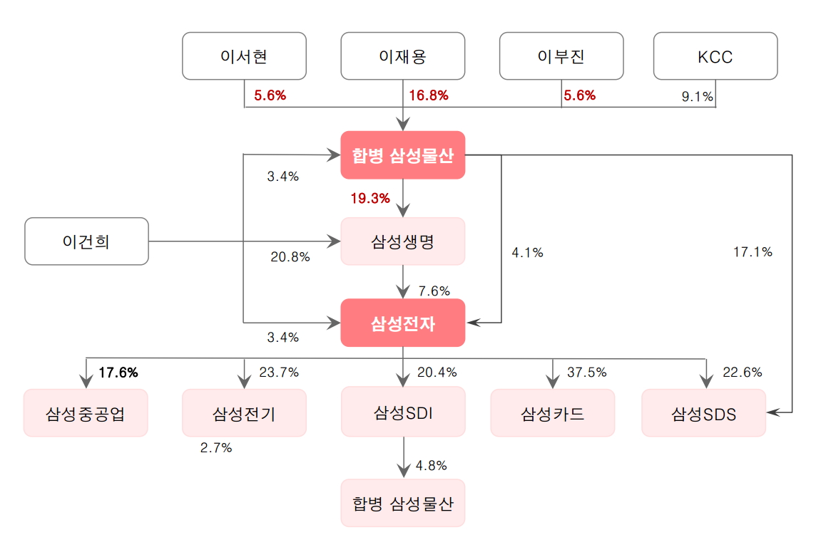 이재용 부회장은 이미 에버랜드를 제일모직과 합병하고 다시 삼성물산과 합병하는 과정에서 통합 삼성물산의 지분을 16.5% 확보하고 있다. 아버지와 두 여동생의 지분을 더하면 30.4%에 이른다. 이건희 회장 시절, 에버랜드가 삼성생명을 지배하고 삼성생명이 삼성전자를 우회 지배하는 구조였다면 이재용 체제에서는 삼성물산이 삼성생명과 삼성전자를 각각 직접 지배하는 구조로 바뀌게 된다.