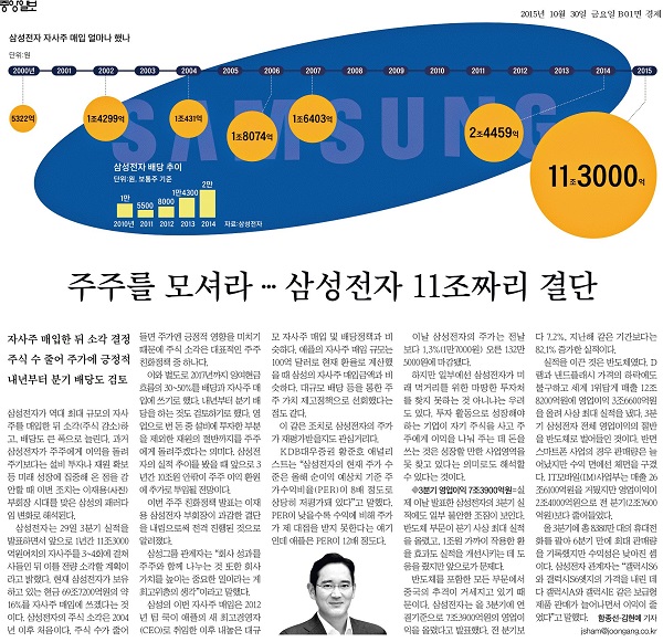 삼성전자의 자사주 매입·소각 발표는 언뜻 이해하기 어렵다. 삼성전자는 지난달 29일 “향후 1년 동안 11조3000억원 규모의 자사주를 매입·소각할 계획”이라고 밝혔다. 언론 보도는 “이재용식 주주 친화 경영(매일경제)”이라느니 “삼성그룹 지배구조 개편으로 생긴 부정적인 이미지를 털고 가려는 의도가 작용했다(조선일보)”느니 “이재용 부회장의 11조짜리 결단(중앙일보)”이라느니 온갖 찬사가 쏟아졌다. 사상 최대 규모의 주주 환원 정책이라는 평가다.