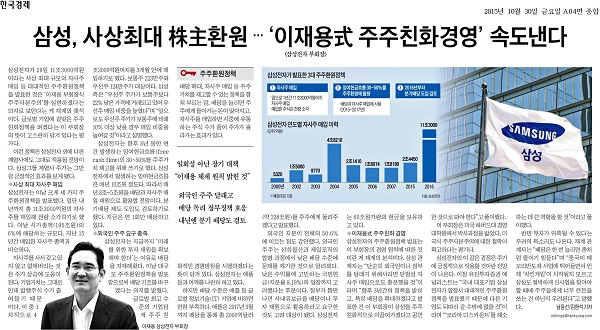 이재용 부회장 입장에서는 삼성전자의 주가를 최대한 낮게 유지하는 게 좋겠지만 주주들의 반발을 의식하지 않을 수 없는 상황이다. 자사주 매입·소각과 배당 확대는 이재용 부회장과 주주들의 이해가 맞물리는 지점이다. 남아도는 현금으로 자사주를 사들이고 배당을 늘린다는데 주주들 입장에서는 굳이 반대할 이유가 없다. 제일모직과 삼성물산의 합병 과정에서 경험했듯이 상당수 주주들은 이재용 부회장과 같은 배를 타는 선택을 할 가능성이 크다.