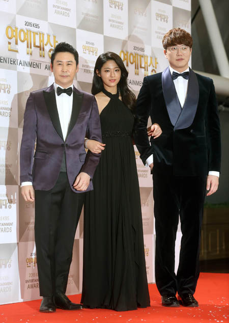 | ▲ 개그맨 신동엽, 가수 설현과 성시경이 2015년 12월26일 오후 서울 여의도 KBS 신관에서 열린 '2015 KBS 연예대상' 시상식에 참석해 포즈를 취하고 있다. ⓒ 연합뉴스 | ||