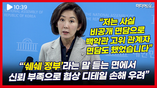 나경원 의원은 “지난주 13명의 여야 의원들이 공동 방미단을 구성해 미국 의회 관계자들 그리고 미국 국무성, 상무부 관계자를 같이 만났고, 저는 백악관 고위 관계자 면담도 했다”며 “대한민국 국익을 위해선 여야가 없기 때문에 관세 협상에 있어 좀 더 유리한 고지를 가기 위해 미국 의원들의 이해를 확대하는 데 있어 노력을 많이 했다”고 자신의 방미 활동을 높게 평가했다.