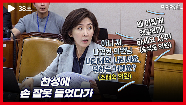 여권 의원들이 다 찬성에 거수한 상황에서 책상 위 자료를 보던 나경원 국민의힘 의원이 찬성에 손을 들었다. 그러자 옆쪽에 앉아 있던 같은 당 조배숙 국민의힘 의원이 “아니 저, 나경원 의원님, 내리세요. 내리세요. 뭐 하는 거예요?”라고 말했다. 같은 당 송석준 의원도 “왜 이렇게 헷갈리게 하세요. 자꾸”라며 면박을 줬다. 쇼츠 영상엔 나경원 의원이 여권 의원들과 같이 찬성에 손을 들었다가 급히 손을 내리며 “이의 있다”고 말하는 장면이 생생하게 담겼다.
