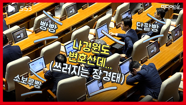 또 이진숙 위원장이 “이사를 선임하는 추천 단체에 변호사 단체 그리고 방송 미디어 단체가 들어가 있어요. 오케이 좋습니다. 변호사 중요하죠. 여기도 변호사 출신들 많으시니까 좋습니다”라고 하자, 장경태 의원은 “본인 앞에도 변호사 있어요. 본인 앞에도”라며 웃음을 터트렸다.